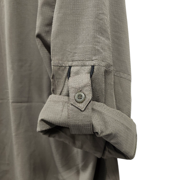 2-piece self collar construction. Button down collar. Back modern yoke. Hemmed bottom. Modern fit. Chest pockets with snap buttons. Rod loop on chest. Vented in back. Rod loop on chest. Mesh lining. Provides UPF 40 sun protection.
