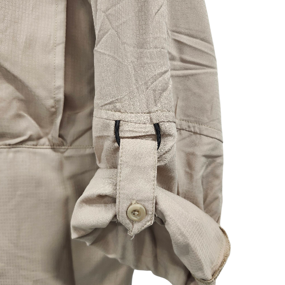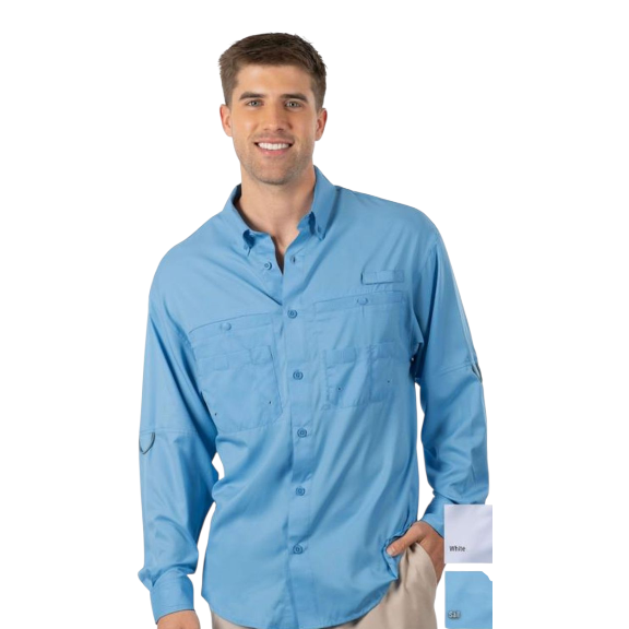 2-piece self collar construction. Button down collar. Back modern yoke. Hemmed bottom. Modern fit. Chest pockets with snap buttons. Rod loop on chest. Vented in back. Rod loop on chest. Mesh lining. Provides UPF 40 sun protection.